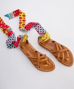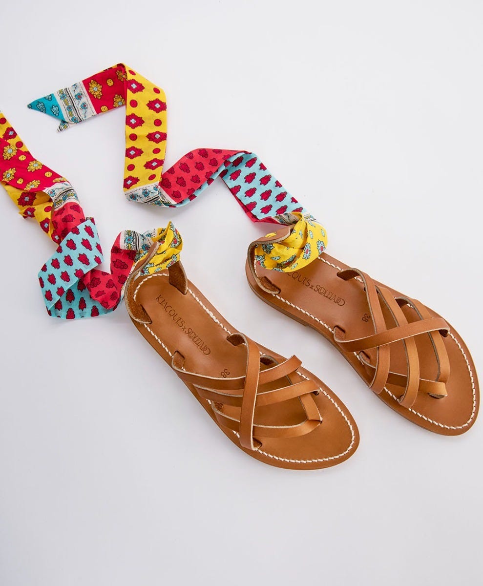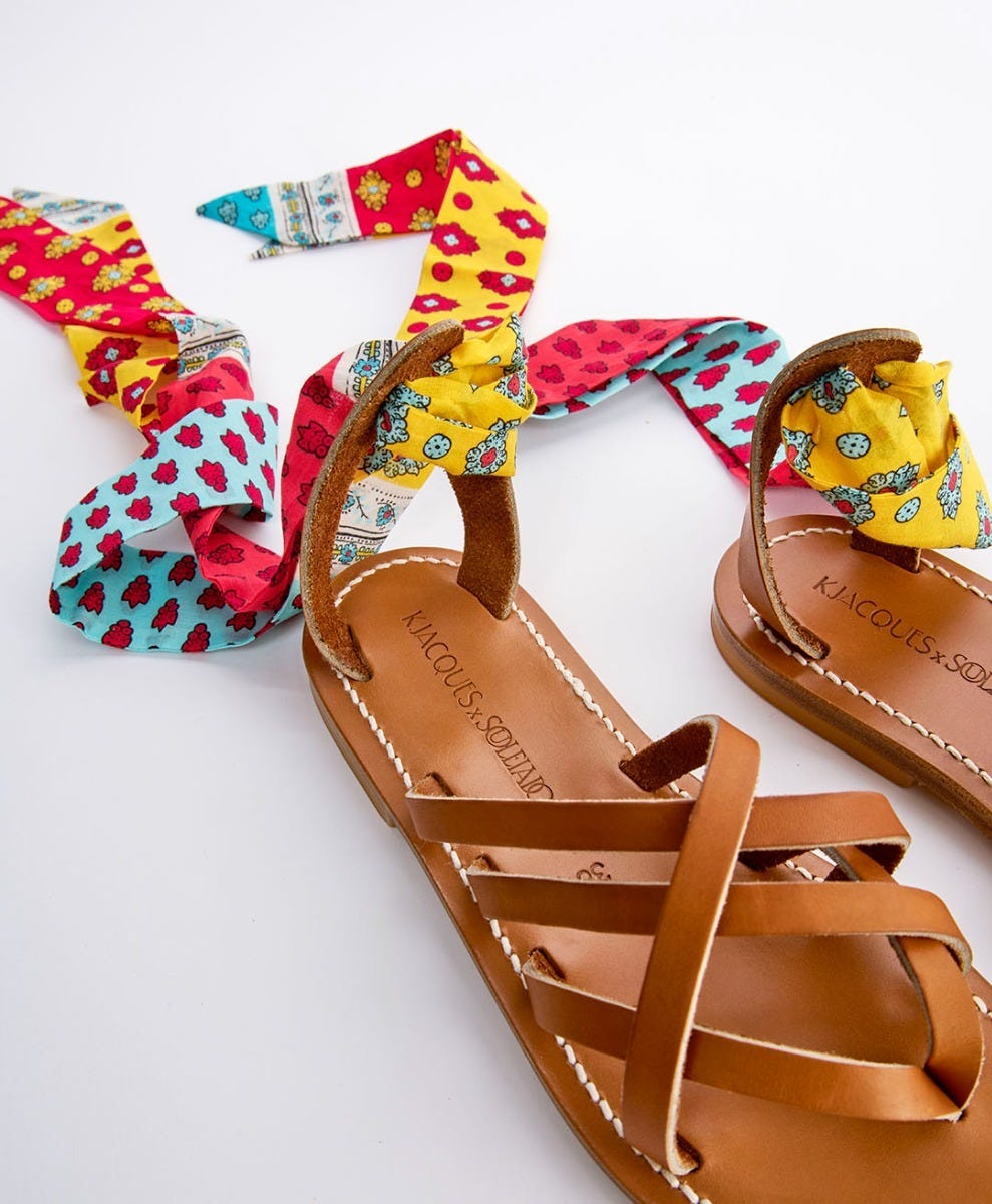 - À la fois raffiné et décontracté, le modèle Laconie en collaboration avec K.Jacques se caractérise par le jeu de croisement des brides en cuir sur le cou-de-pied. Sa talonnière en forme de patte d’oie maintient le talon avec élégance et s’attache solidement au pied grâce à ruban imprimé Souleiado à nouer autour de la cheville.