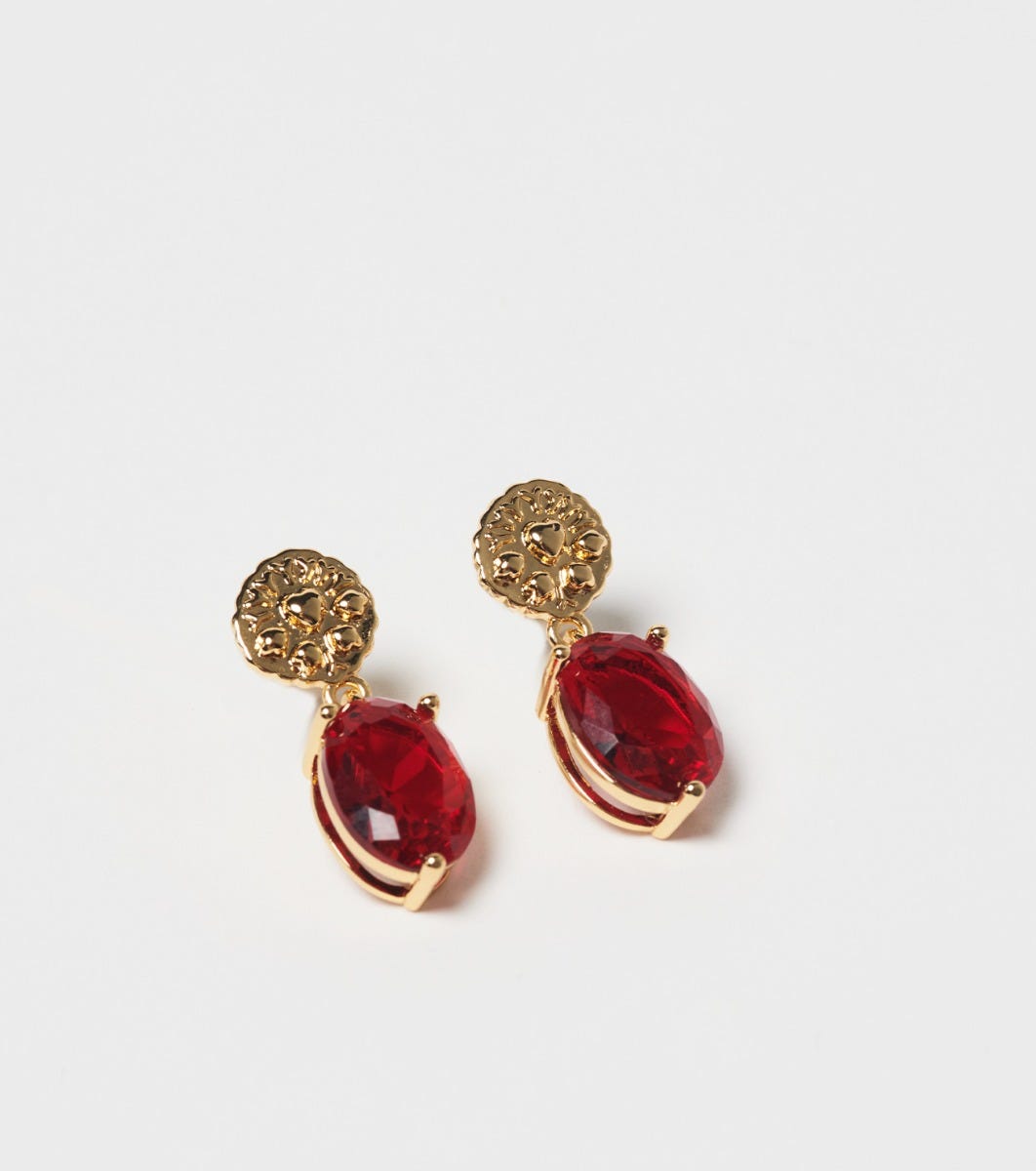 - Boucles d’oreilles puce Fleur d’Arles doré et pierre en verre ovale rouge.