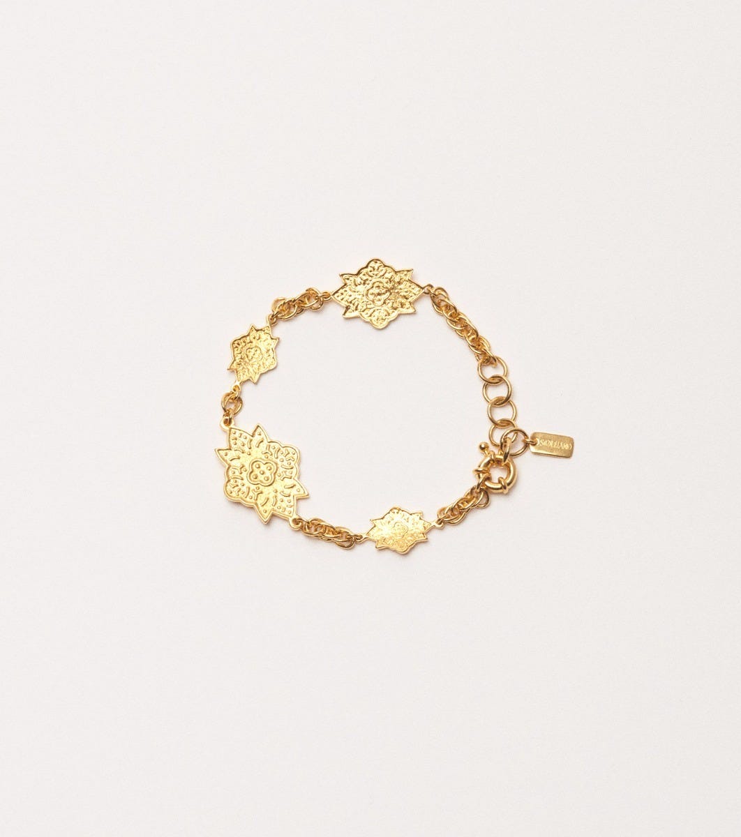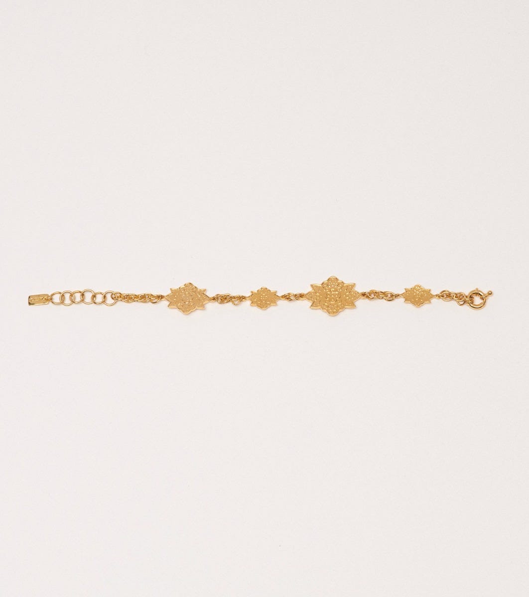 - Bracelet en laiton doré à l’or fin, composé d’une chaîne à la maille fantaisie et habillée de notre iconique motif Merveille dorée de 3 tailles différentes.