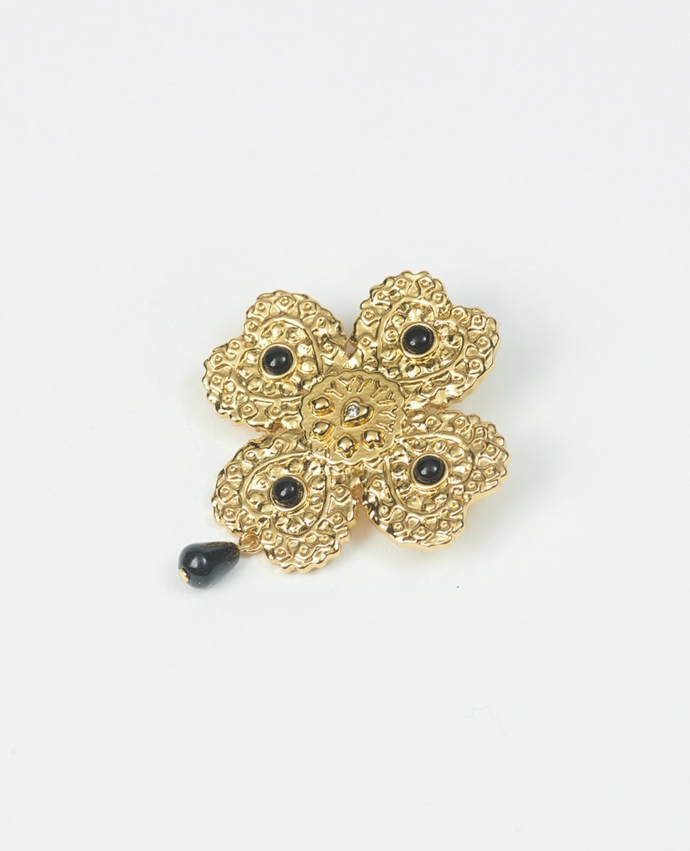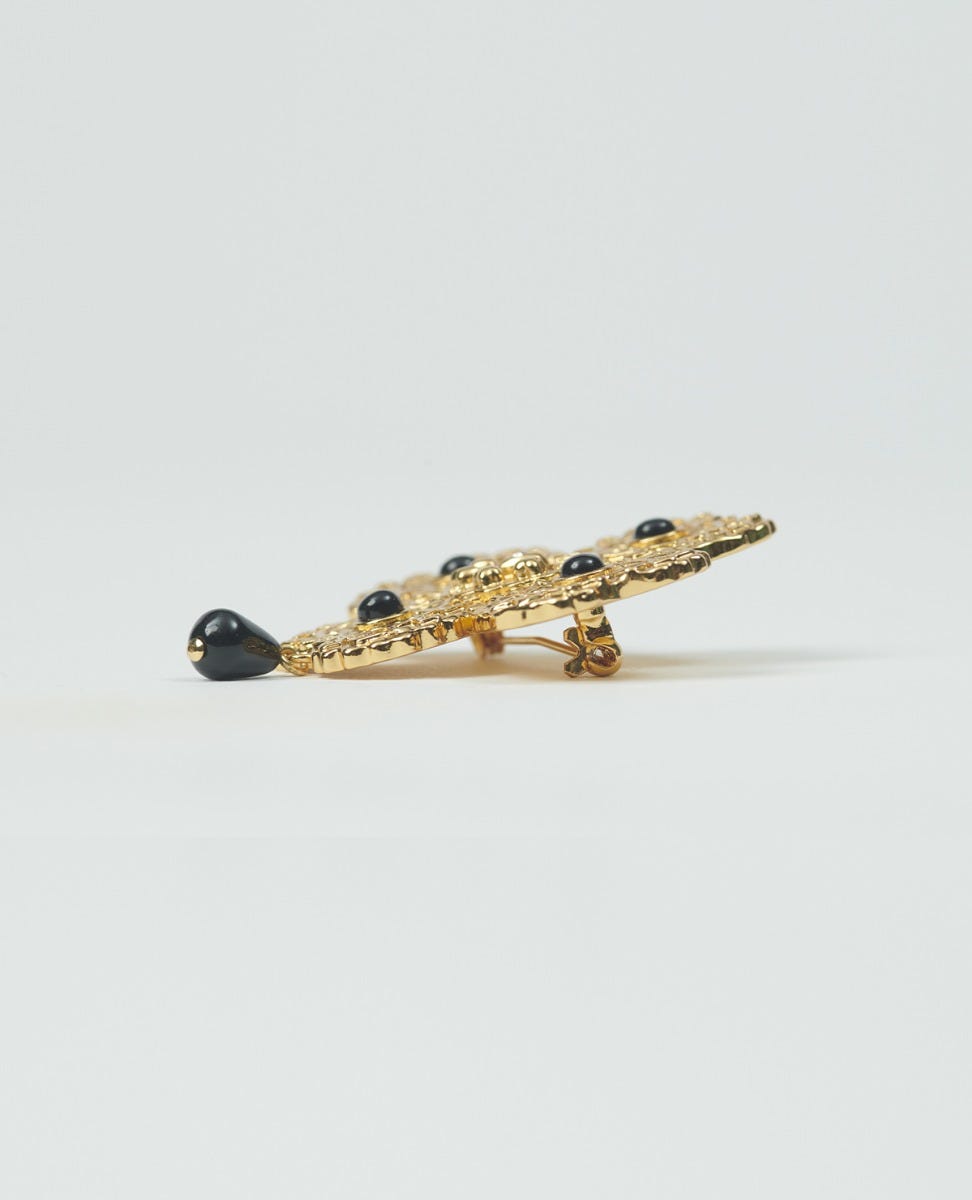 - Broche dorée débossée avec Fleur d’Arles au centre entourée de délicats coeurs, ornées de petite pierres de verres noires et de pierres blanches.