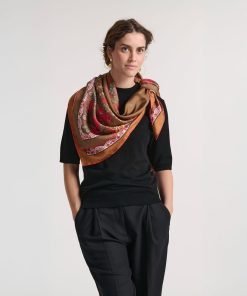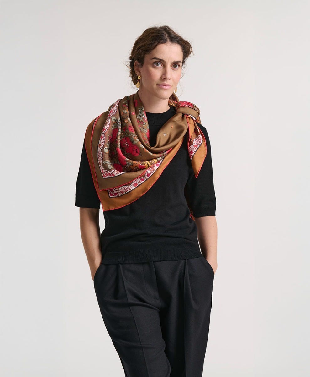 - Drapé autour du cou, porté en ceinture ou posé sur les épaules, ce foulard devient un geste de style, un instant suspendu.