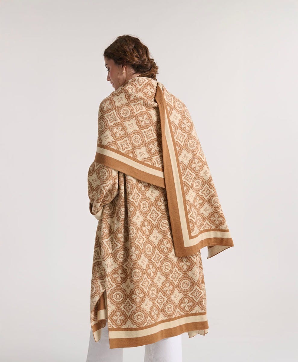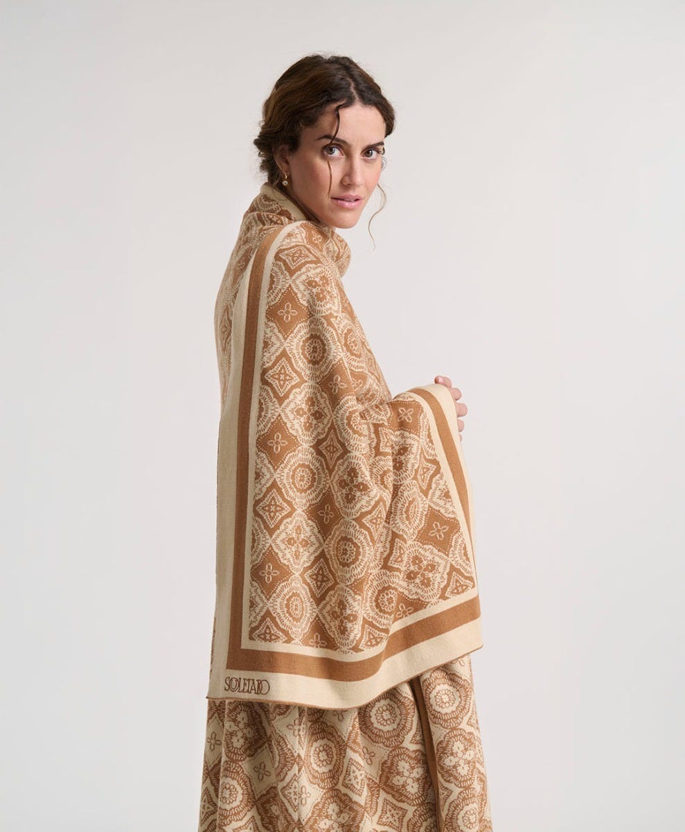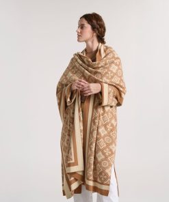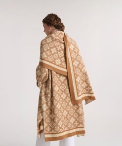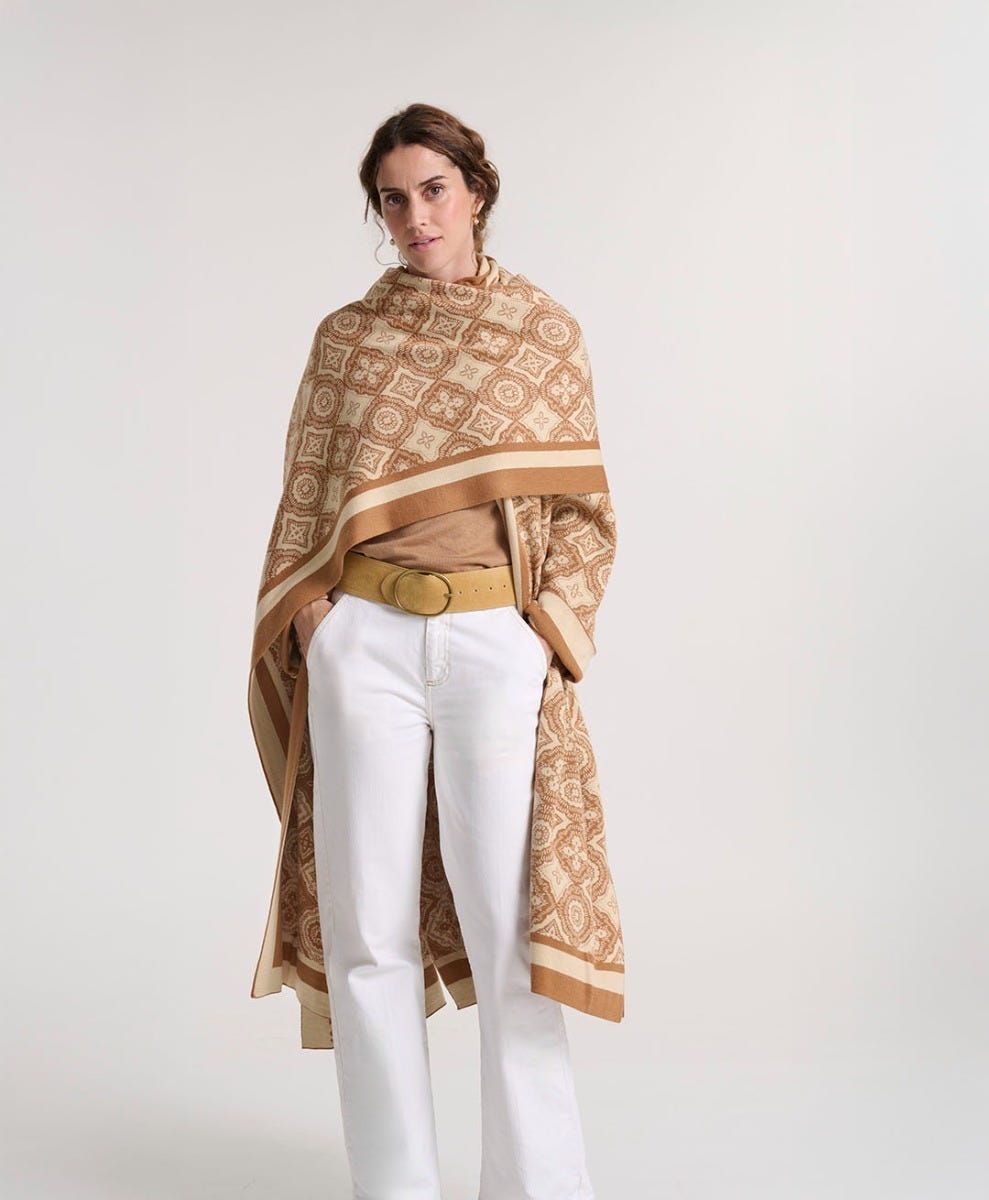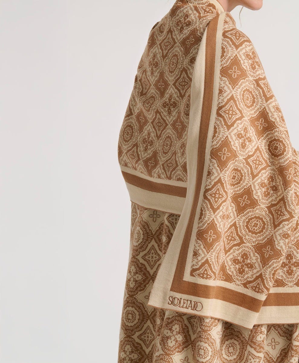 - L’écharpe Grande Mosaïque se distingue par son motif en jacquard, inspiré des géométries architecturales du sud. Déclinée dans un beige doux et naturel, elle offre une palette sobre et raffinée, idéale en toutes saisons.