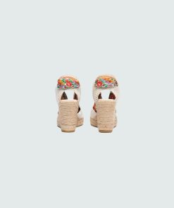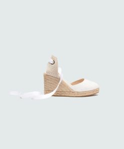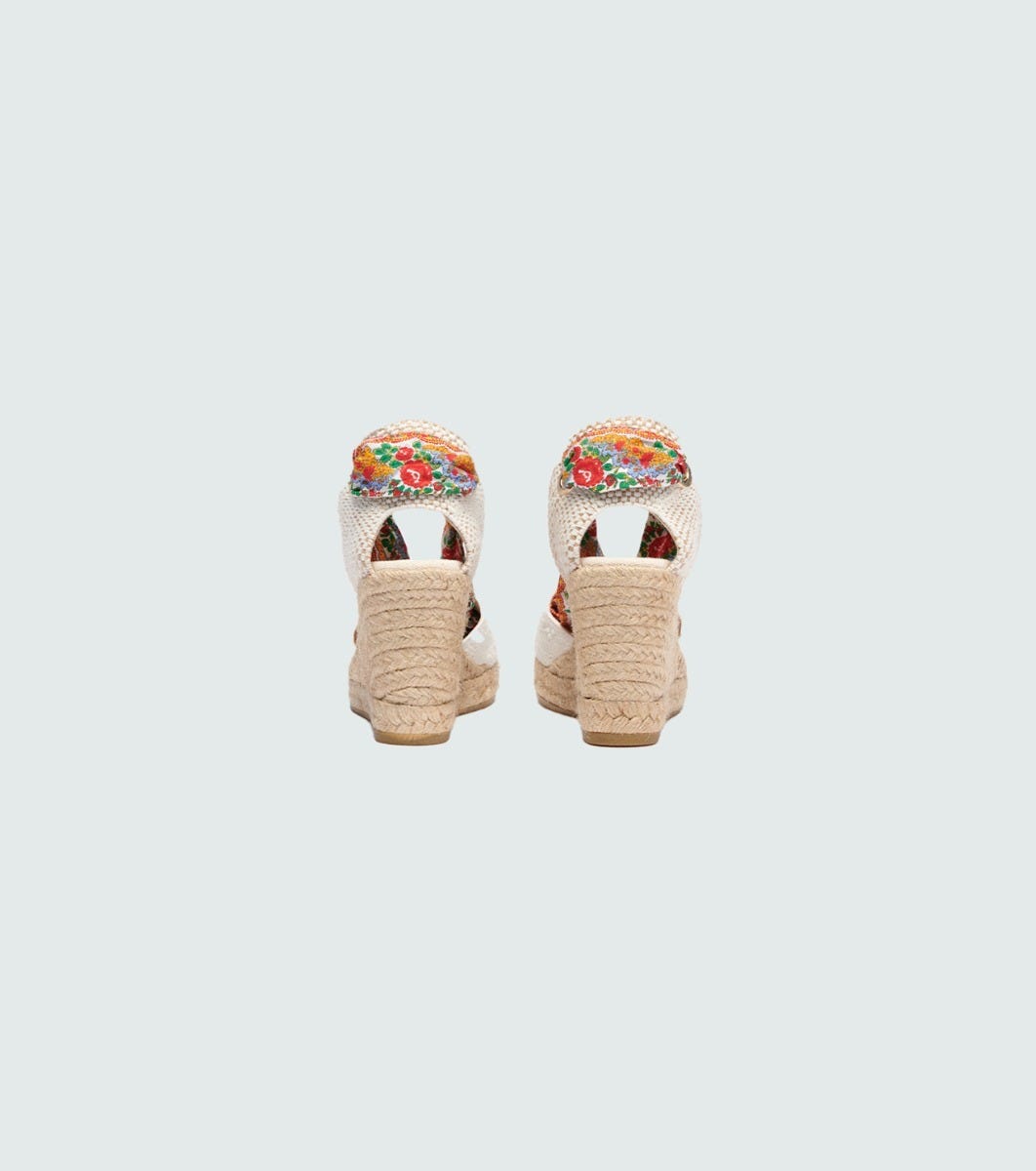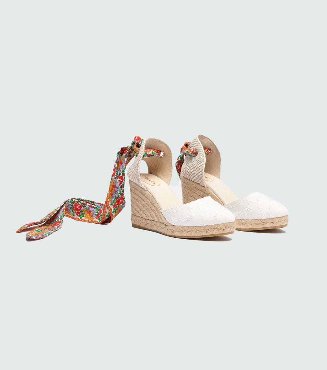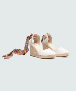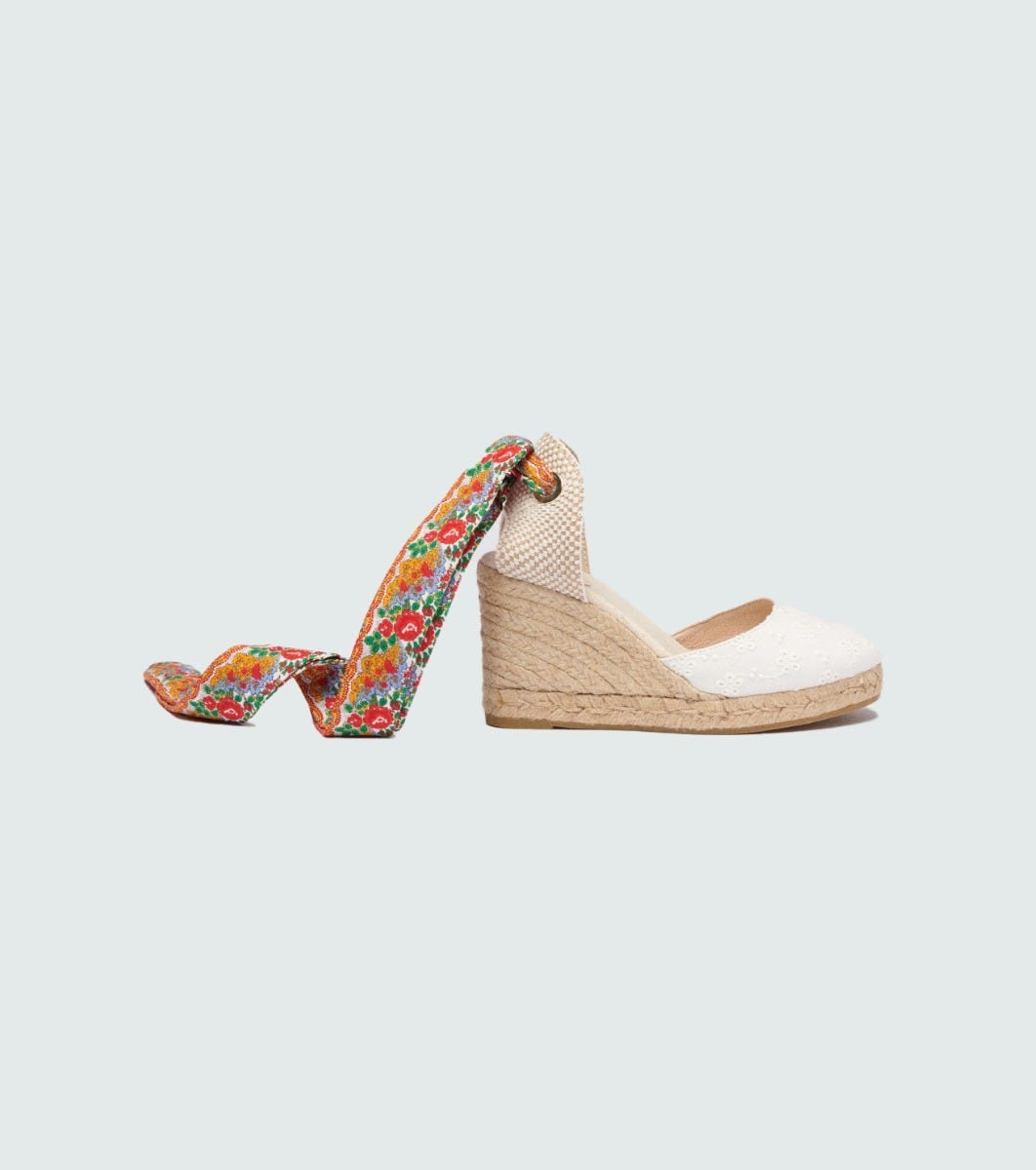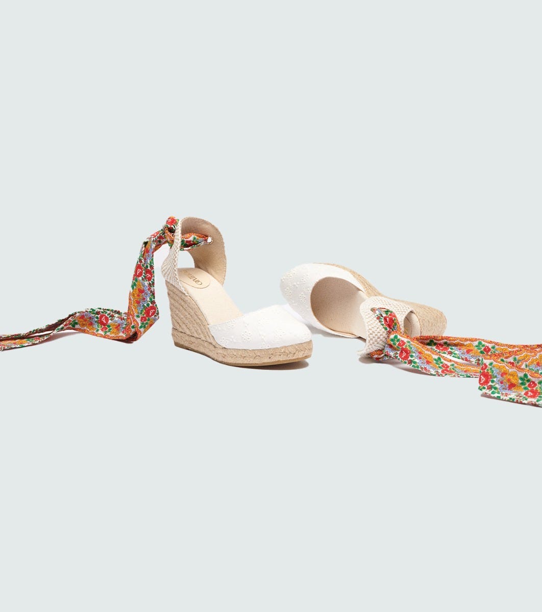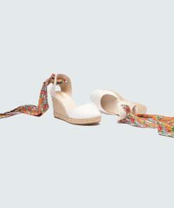 - Dulce, notre espadrille compensée se joue cette saison en délicate broderie anglaise de coton avec fermeture à ruban imprimé à nouer autour de la cheville. L’espadrille est également proposée avec un lien en coton uni blanc pour plus de polyvalence.