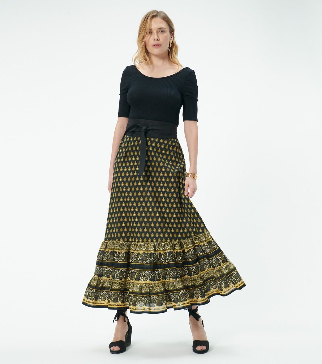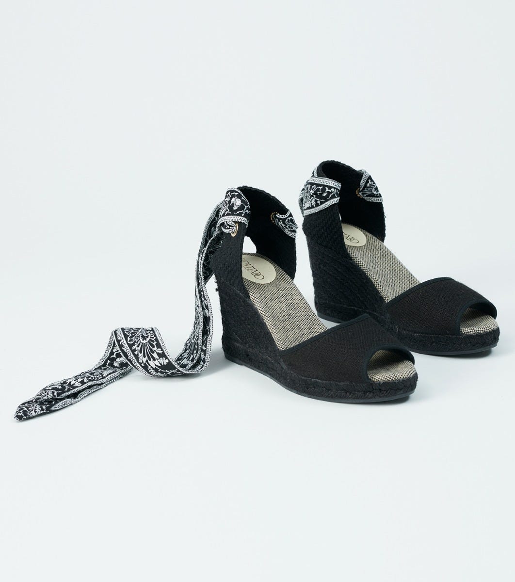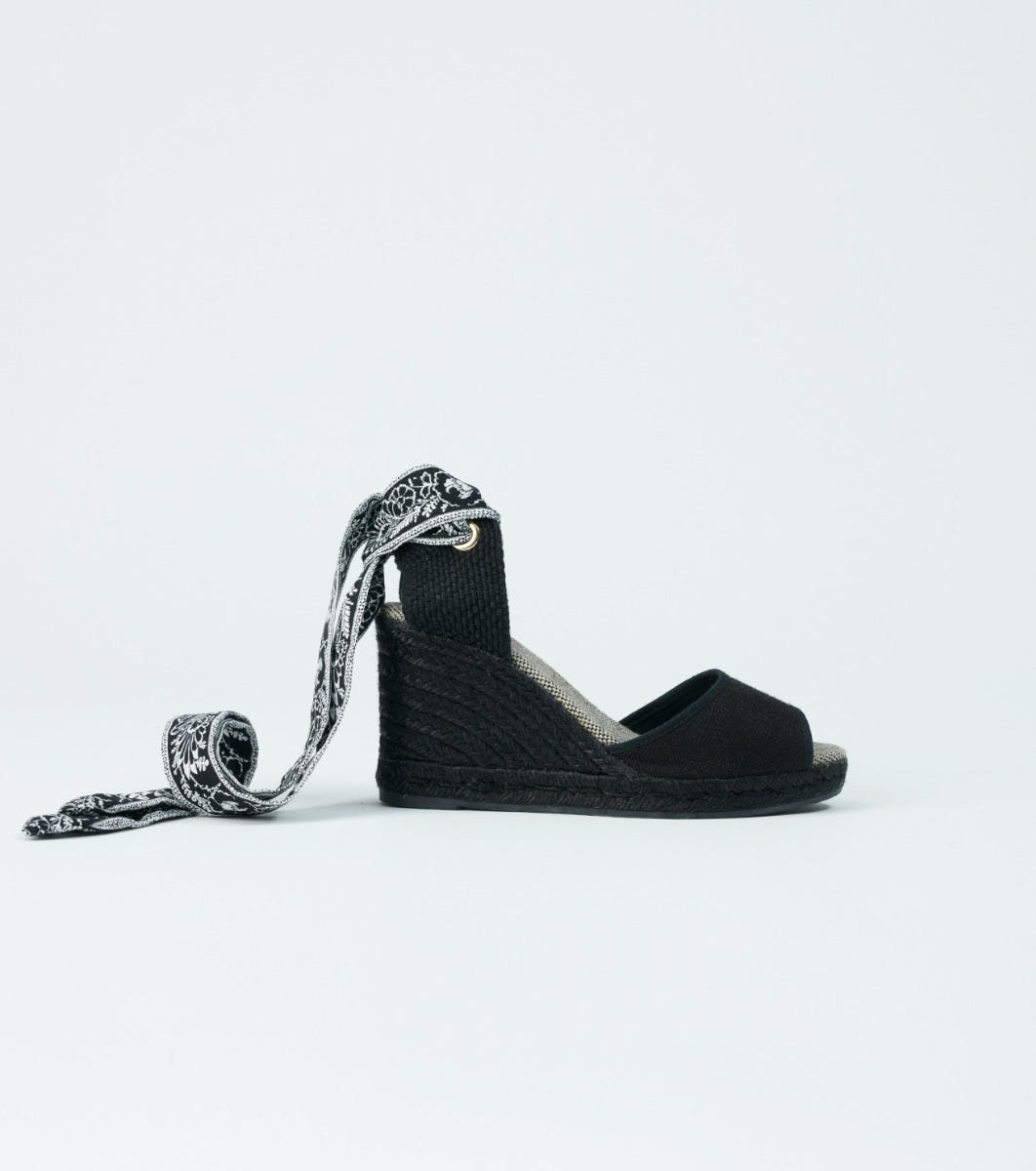 - Julina, notre espadrille compensée à bout ouvert, avec fermeture à ruban imprimé à nouer autour de la cheville. Résolument féminine et intemporelle, cette pièce s’associera avec toutes vos tenues, pour un look quotidien ou chic, selons vos envies. A porter sans hésiter avec nos jupons iconiques ! L’espadrille est également proposée avec un lien en coton uni noir pour plus de polyvalence.