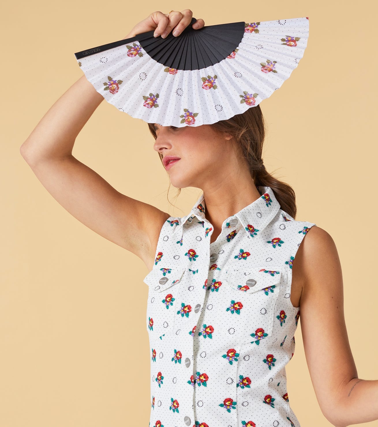 - Éventail en bois naturel peint coloris noir et coton 100% imprimé