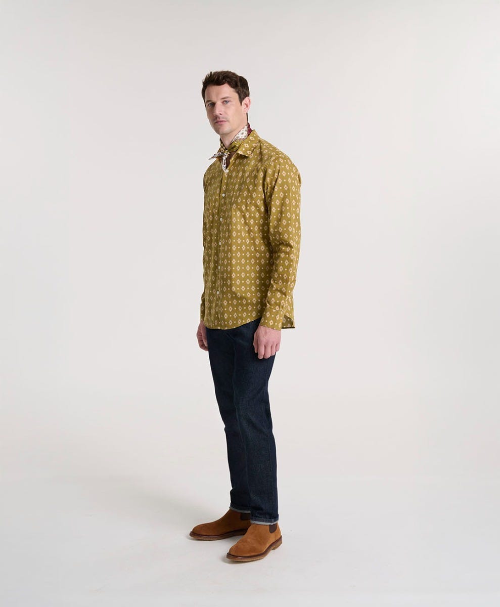 - Le gavroche Italienne, en twill de soie précieux, révèle un motif d’archive réinterprété dans une harmonie subtile de kaki et de curry, couleurs