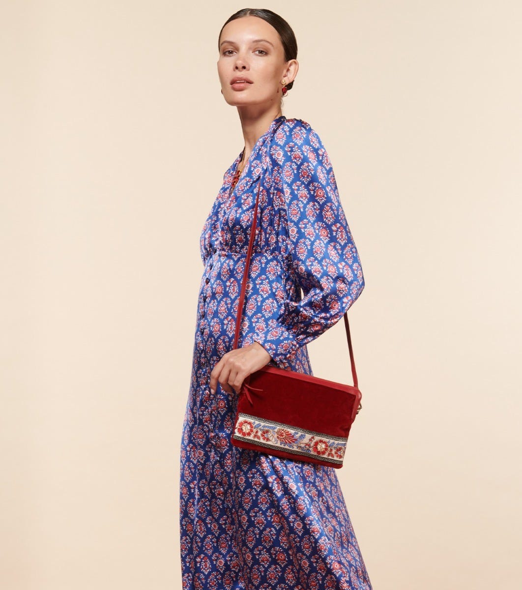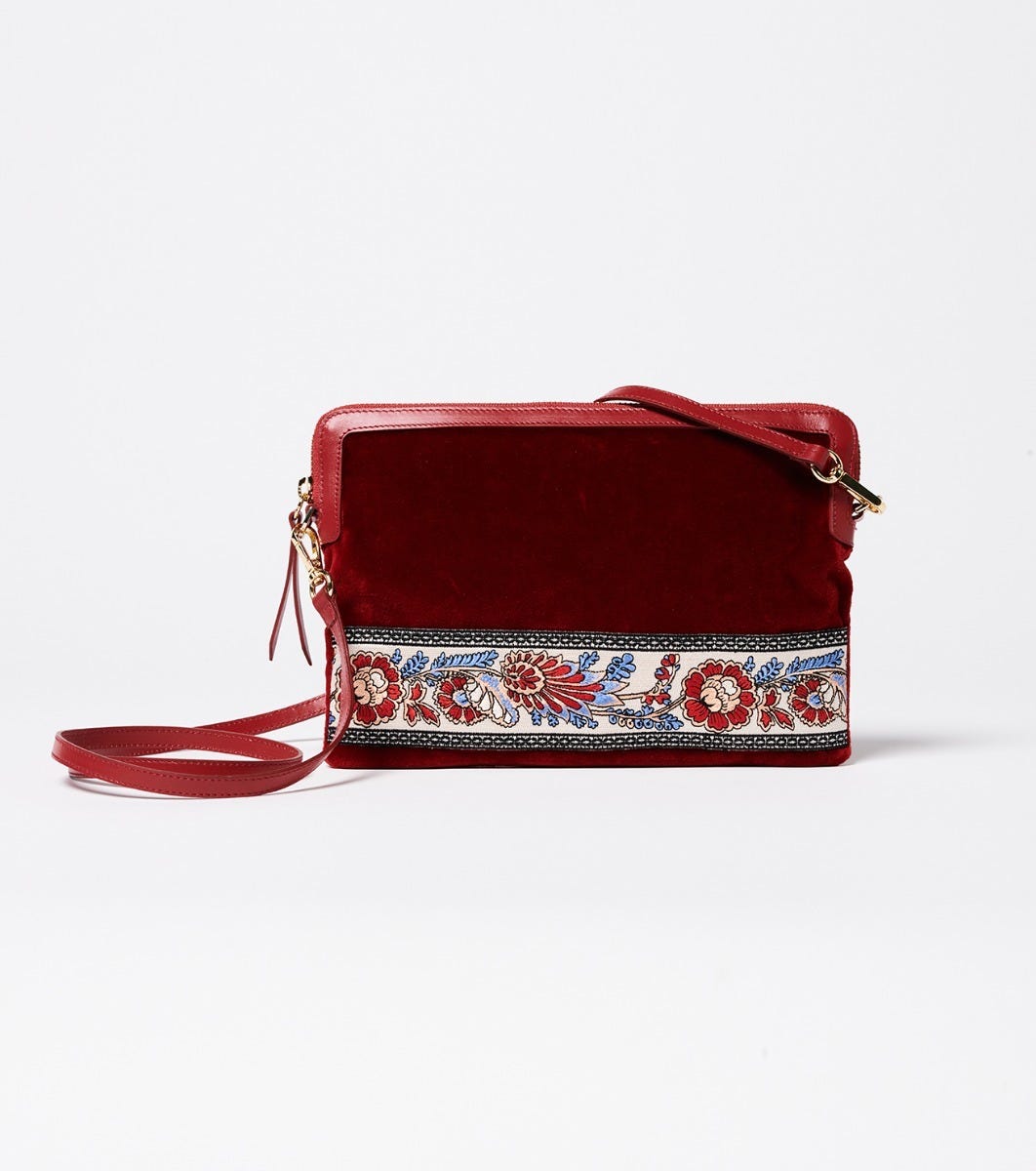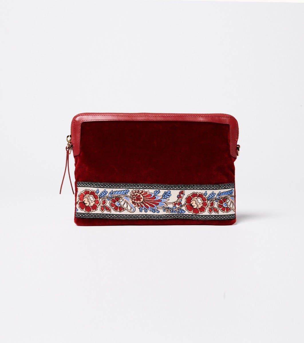 - Pochette rectangulaire en velours lisse agrémentée d’un galon brodé avec notre motif « Le Petit Artichaut » en coloris rouge bleu. Une fine bande de cuir lisse vient finir le haut de la pochette tout en soulignant sa jolie découpe aux coins arrondis. A porter à la main pour un look plus sophistiqué ou à l’épaule pour un côté plus décontracté, sa bandoulière en cuir amovible vous permet de l’adapter selon vos besoins et vos envies.