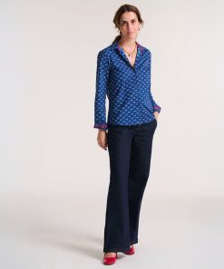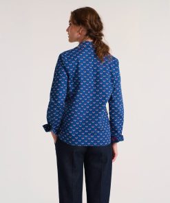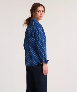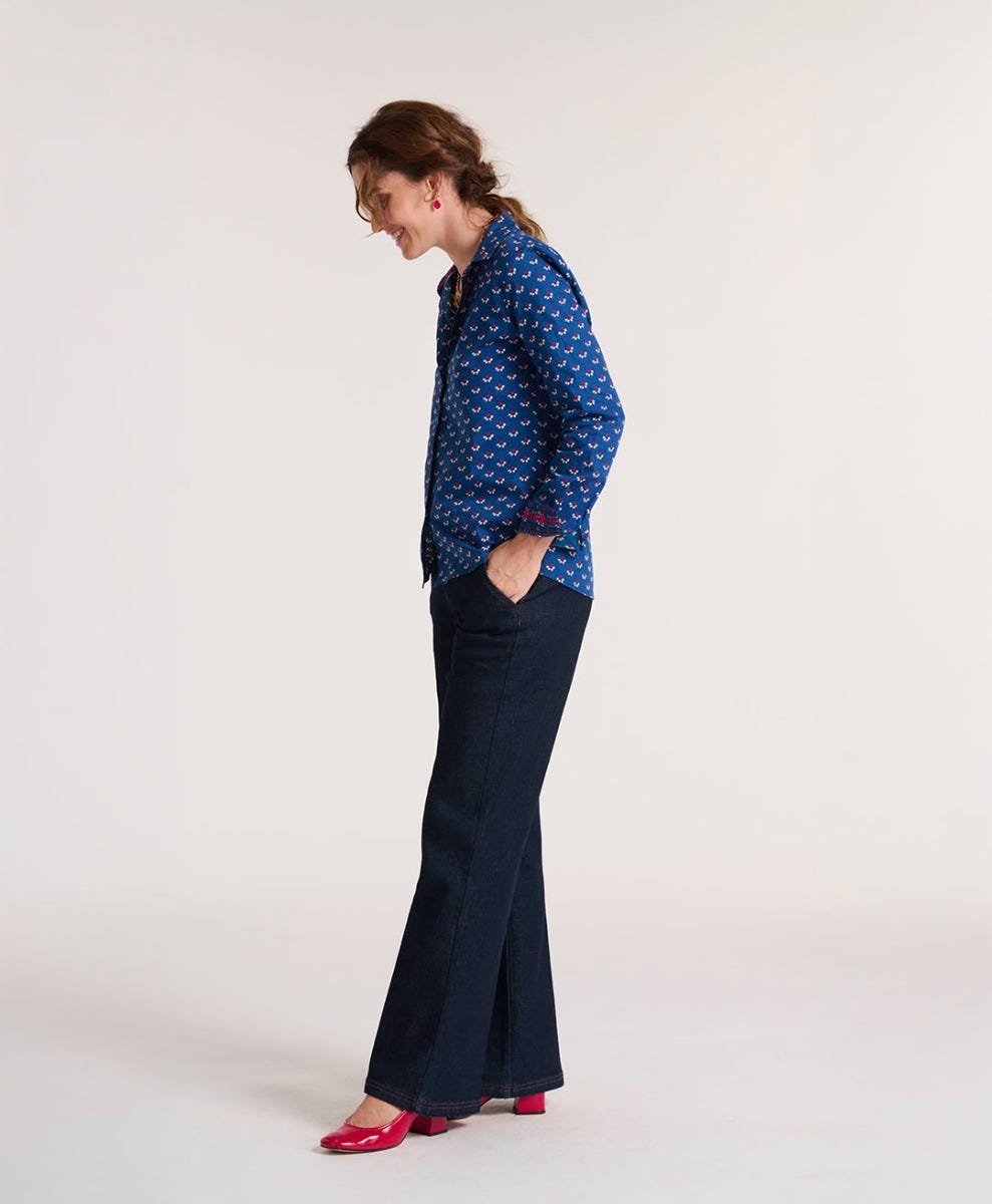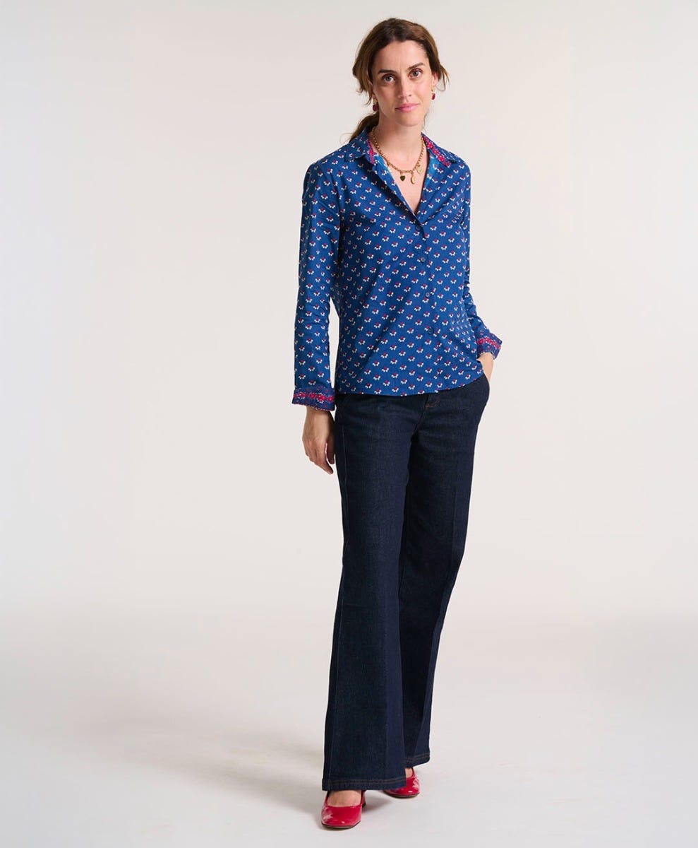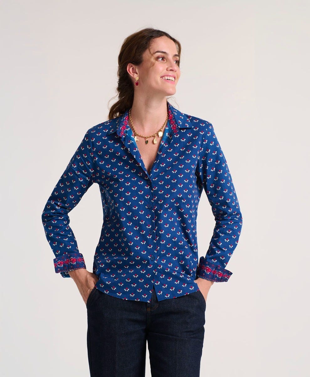 - Détails de frise imprimée avec notre motif « Frise Printanière » bleu écru au pied de col intérieur, poignets et sous gorge