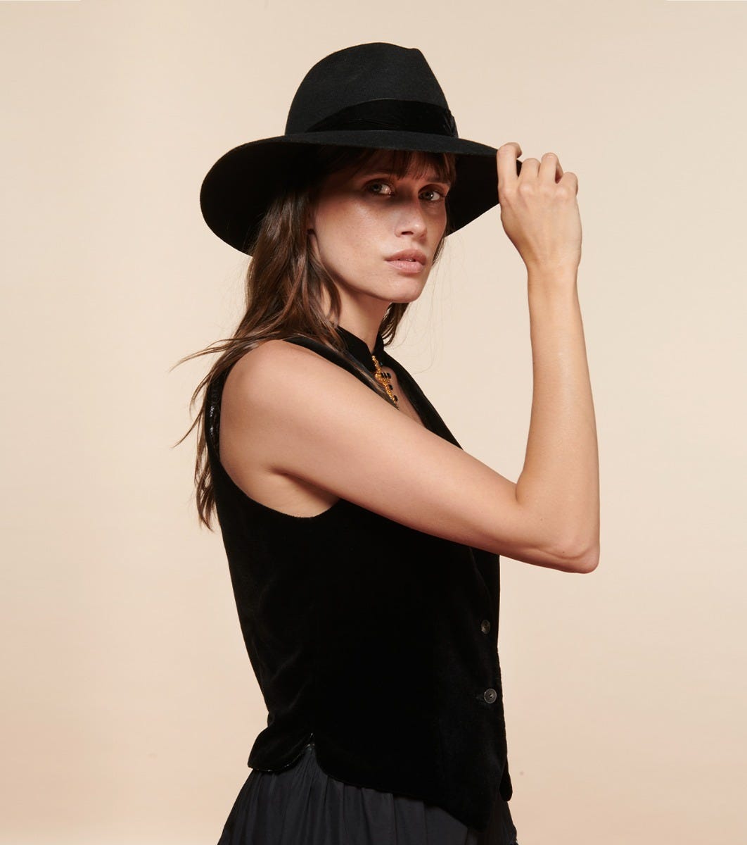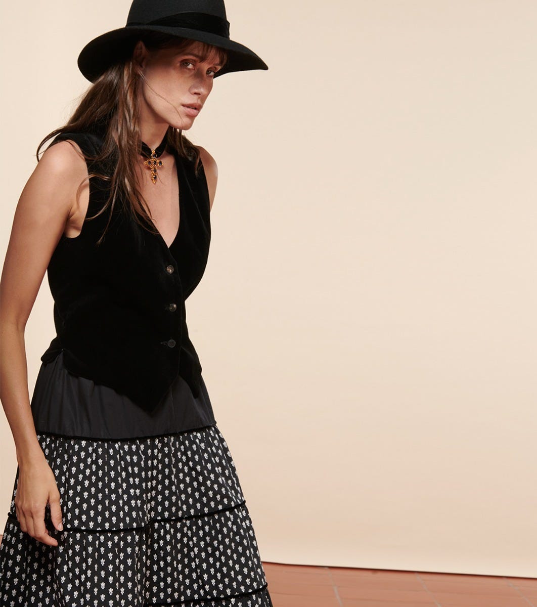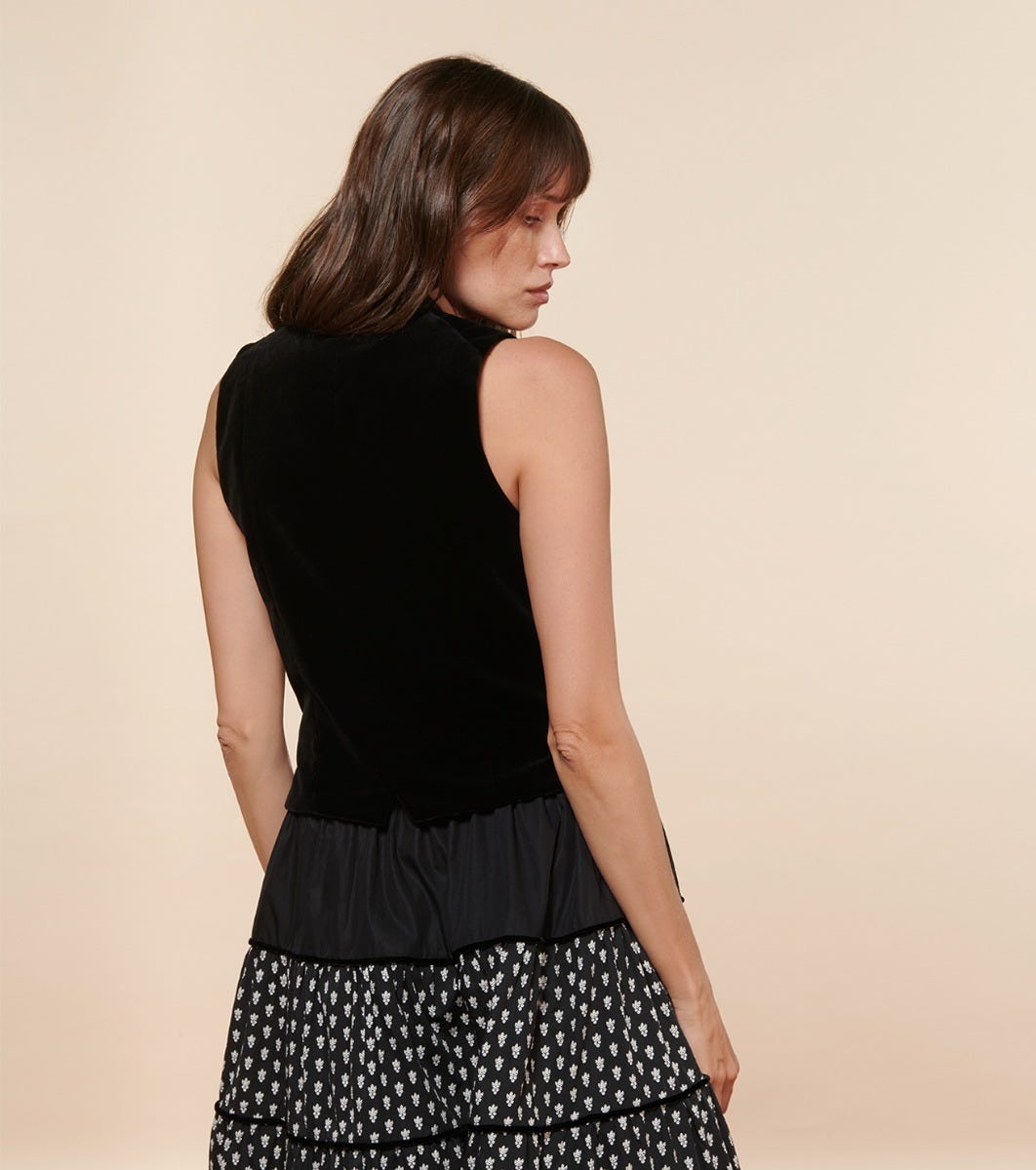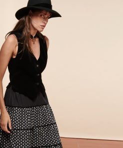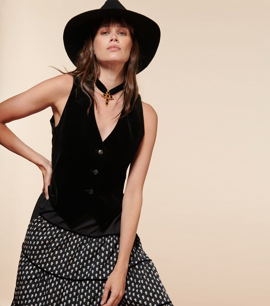- Escamillo, notre gilet de tailleur court piqué au vestiaire masculin, se pare de velours pour lui apporter sa touche d’élégance et de féminité. Ses pinces et ses pans travaillés en pointe lui donnent une belle structure.