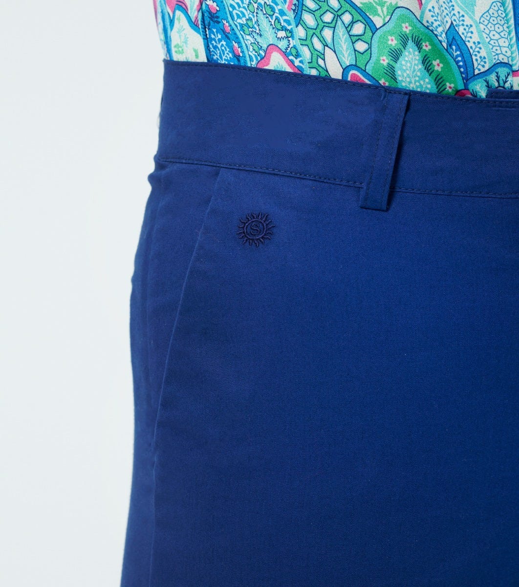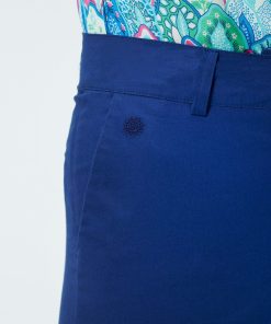 - Pantalon droit ajusté en toile coton élasthane à l’effet peau de pêche