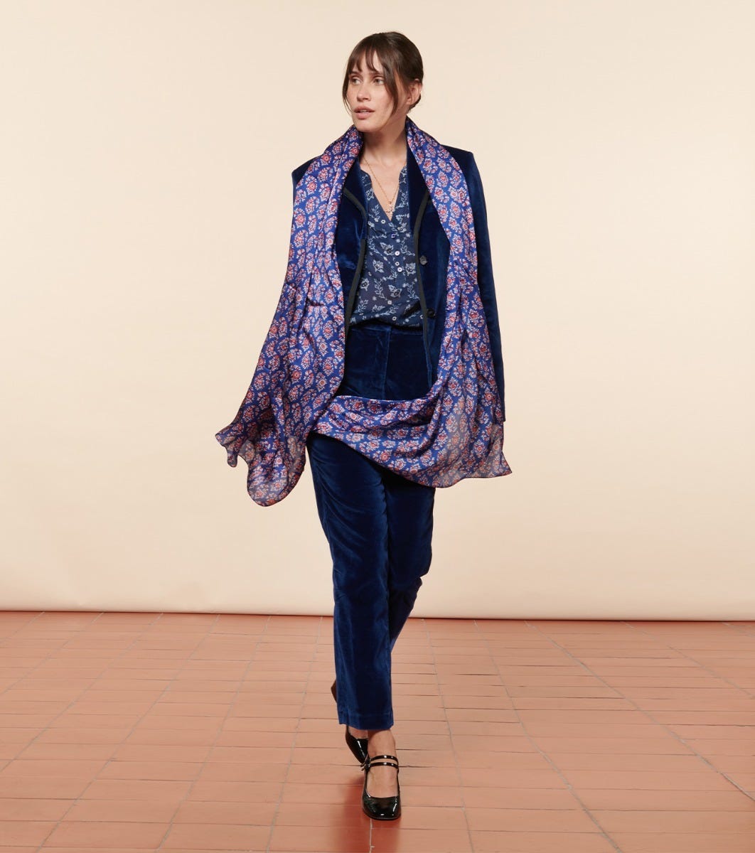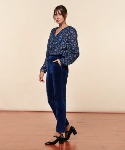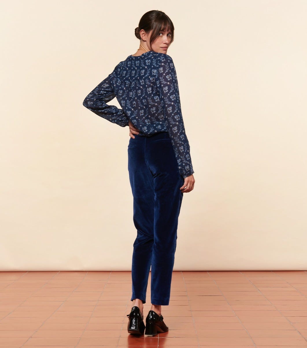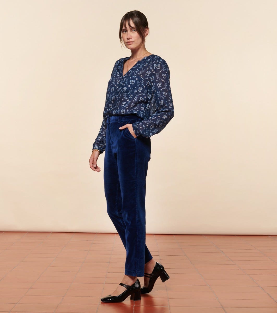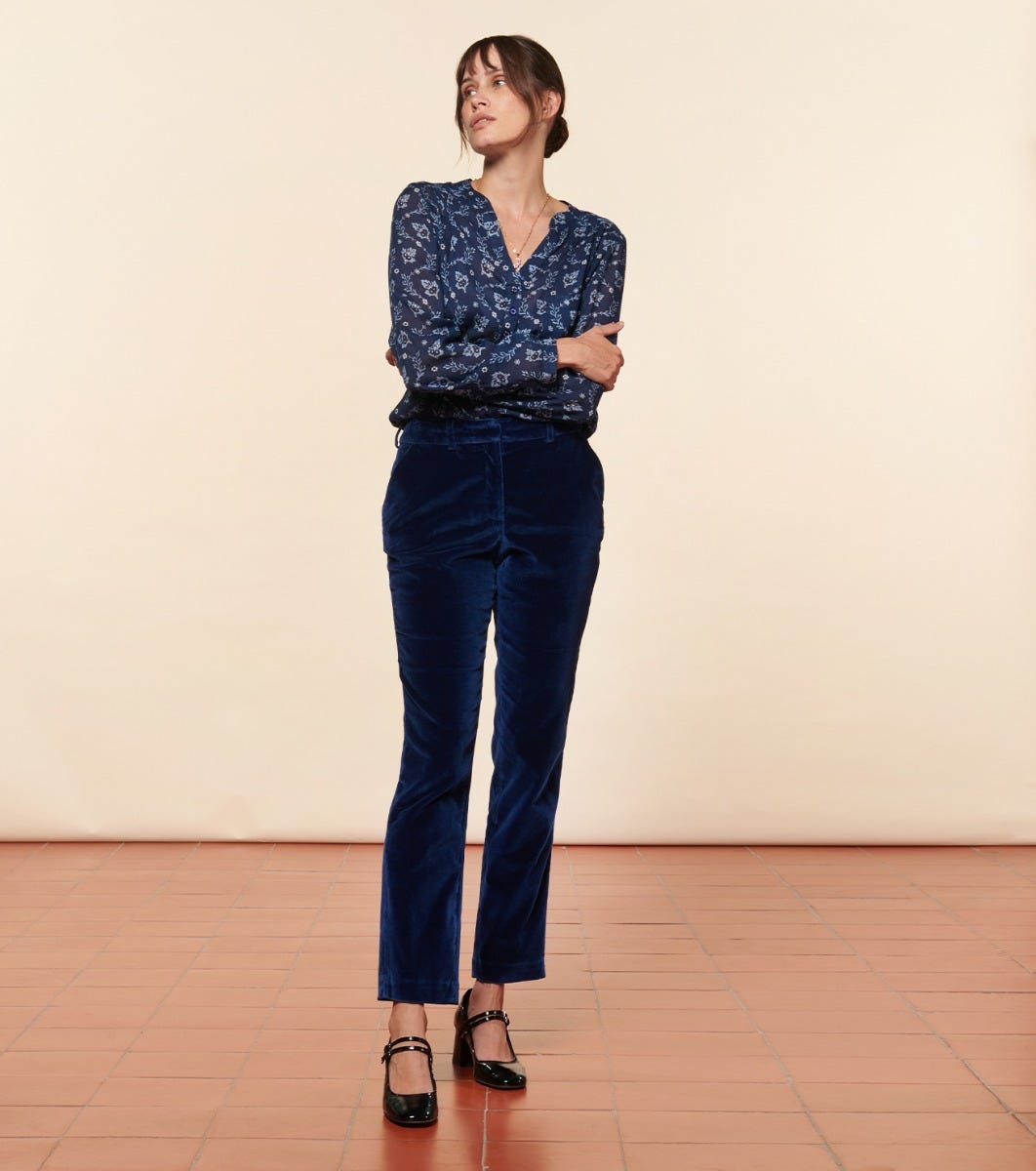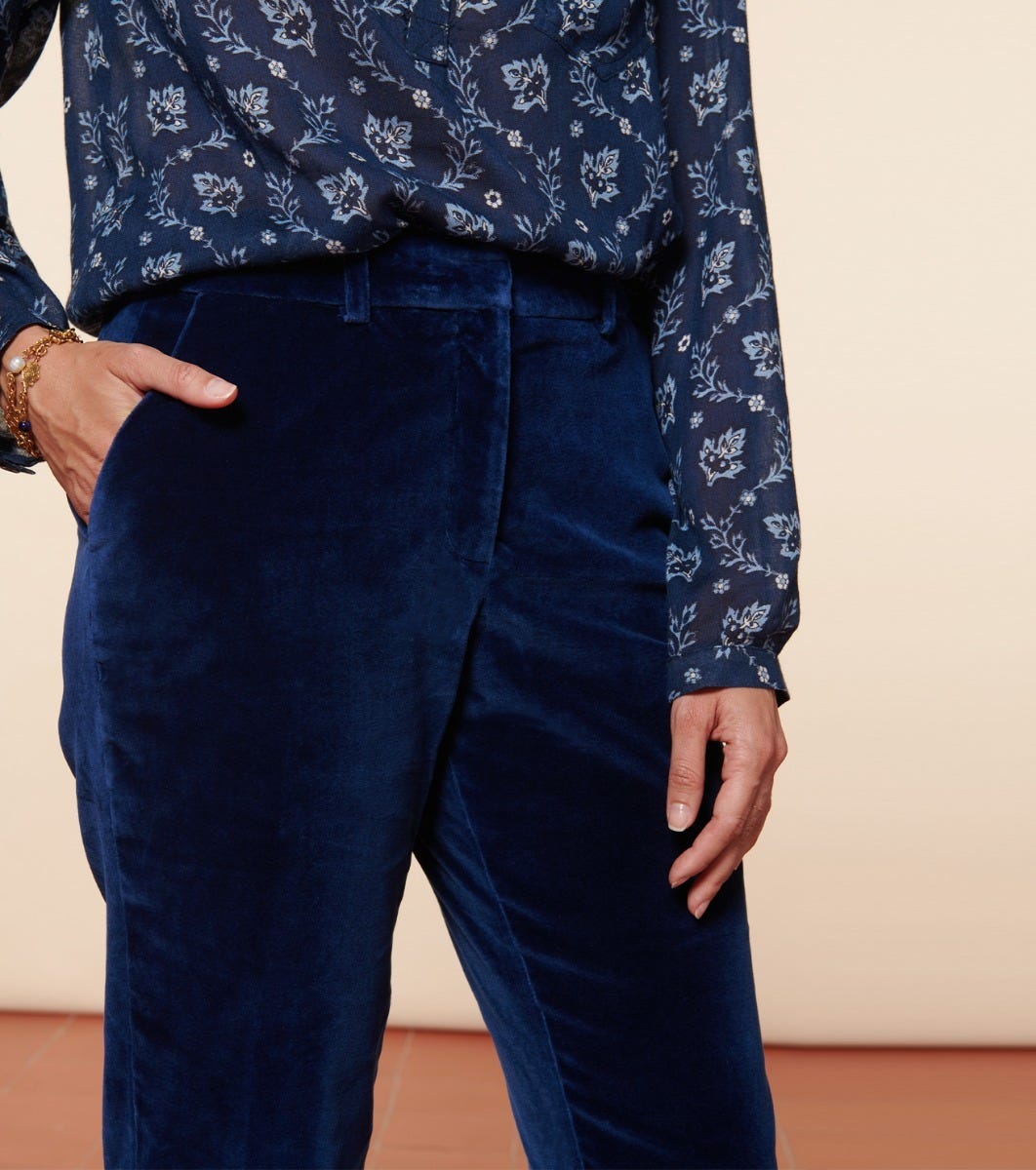 - Pantalon de tailleur droit et légèrement ajusté. Confectionné en velours lisse légèrement stretch pour lui apporter confort et élégance. A associer avec notre veste Chloé, le pantalon Bertille est un classique de la Maison.