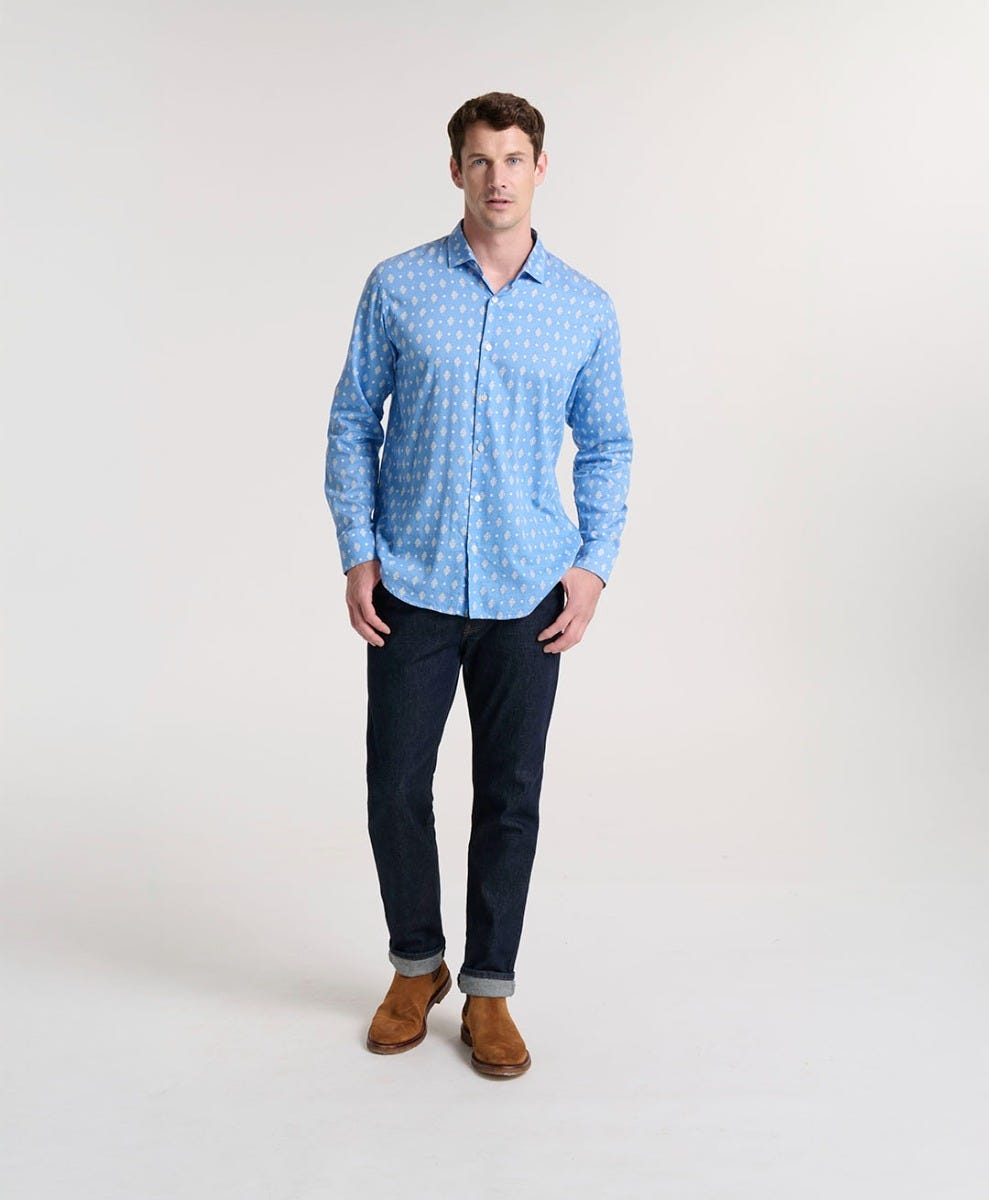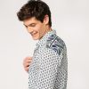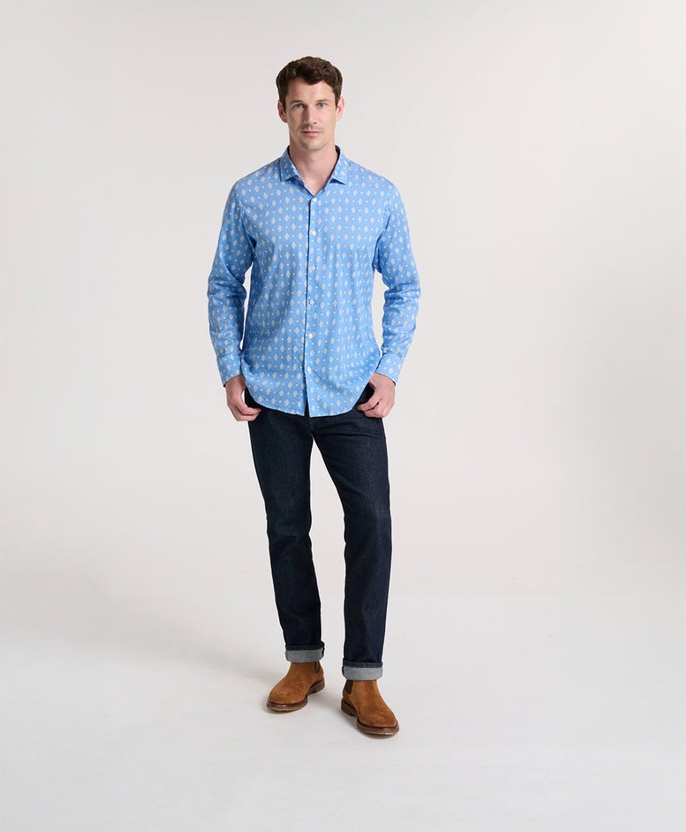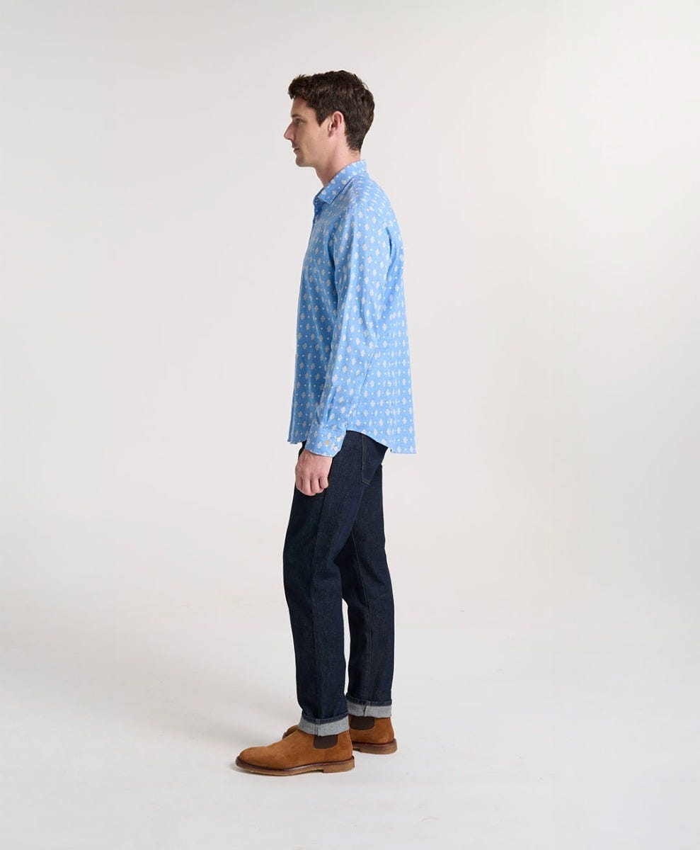 - En satin de coton léger, imprimé avec notre motif iconique « La Merveille » coloris Azur