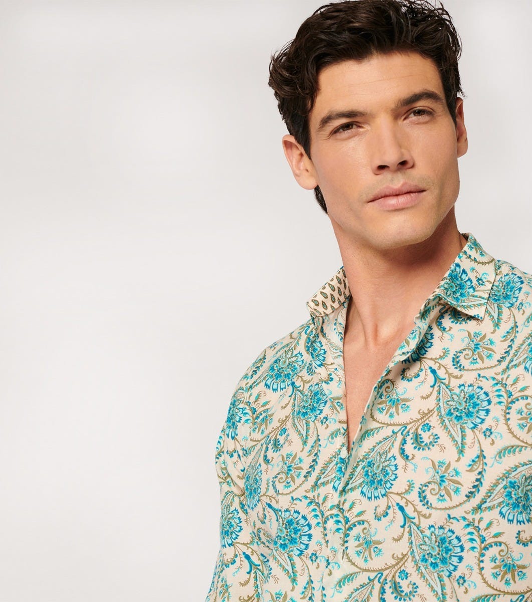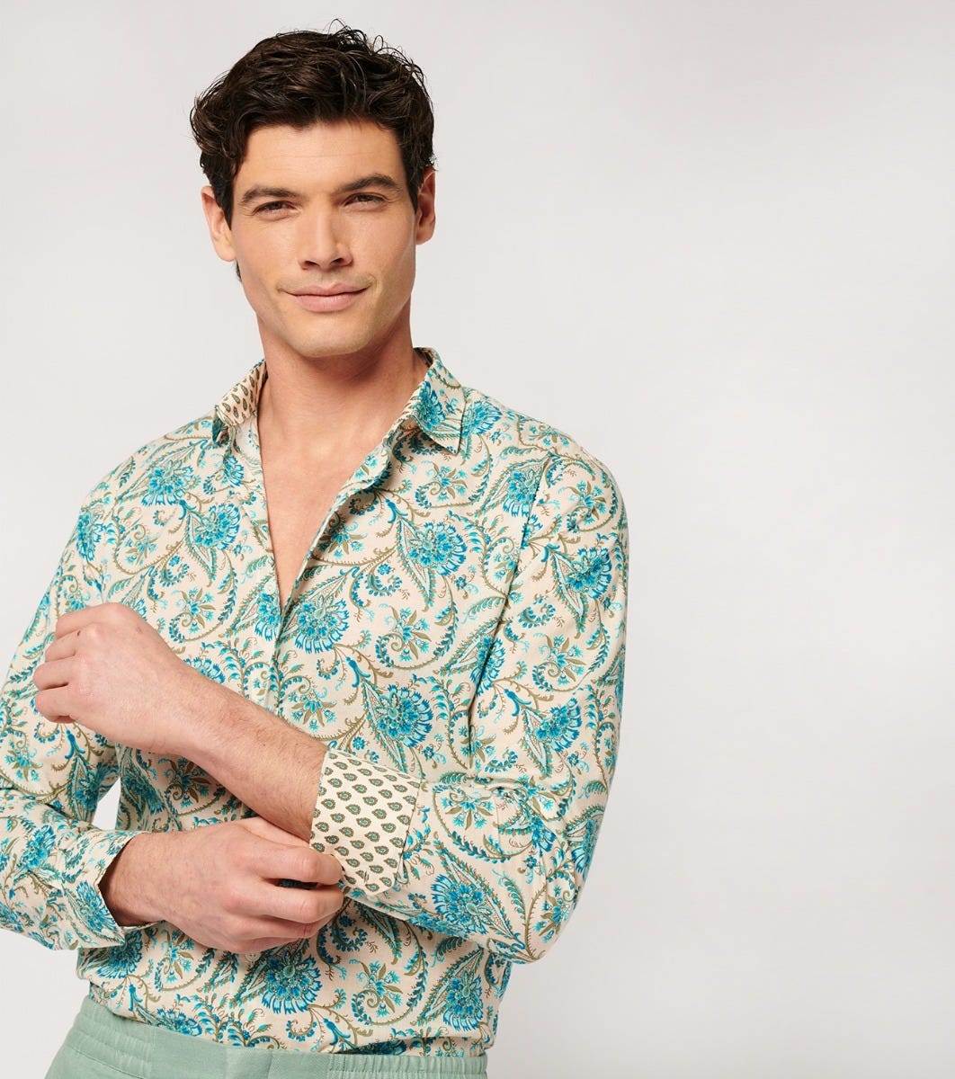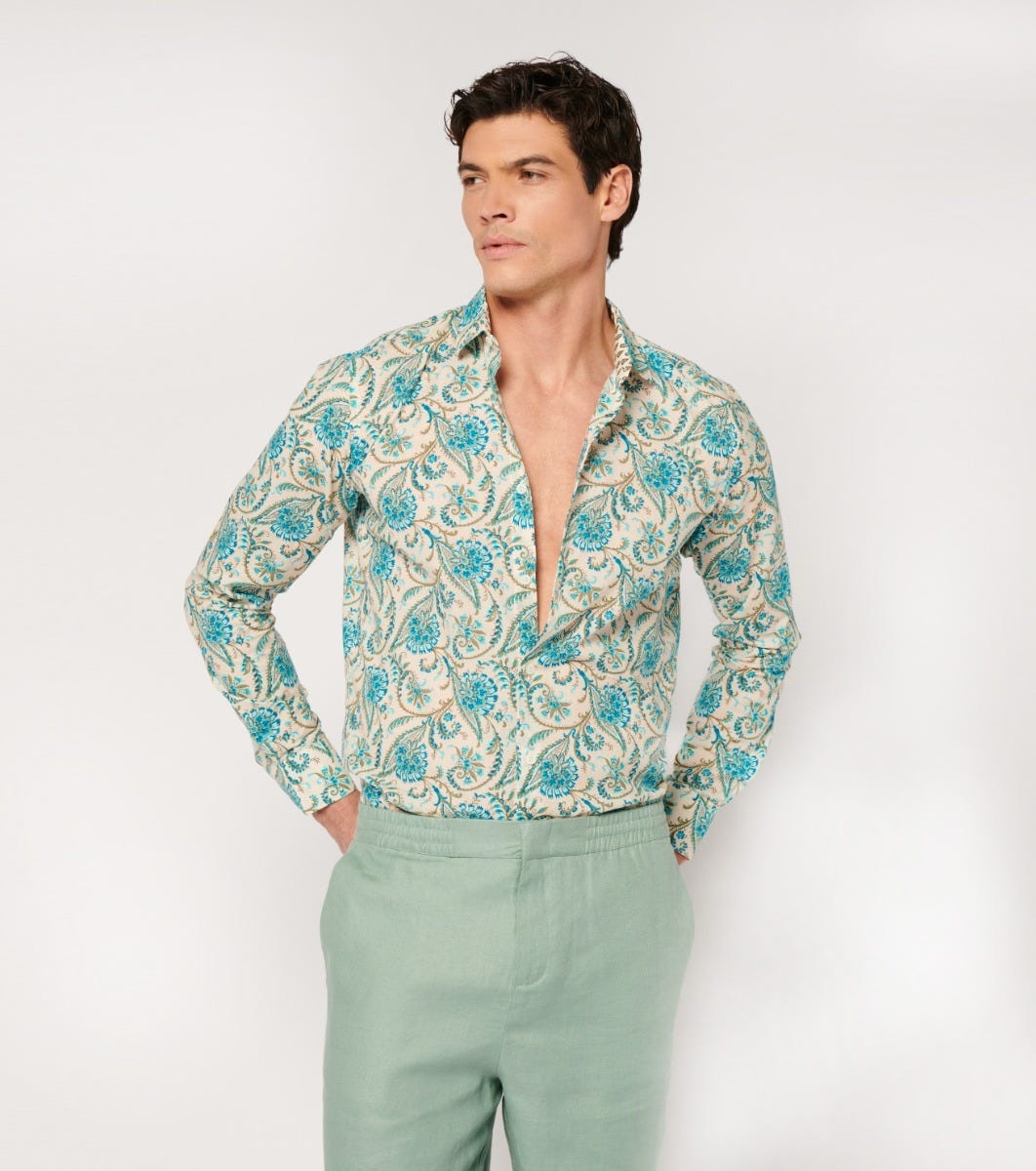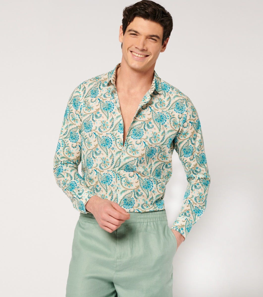 - Détails en opposition intérieure au pied de col et à l’intérieur du poignet avec notre imprimé « Paisely Géo » coloris écru turquoise