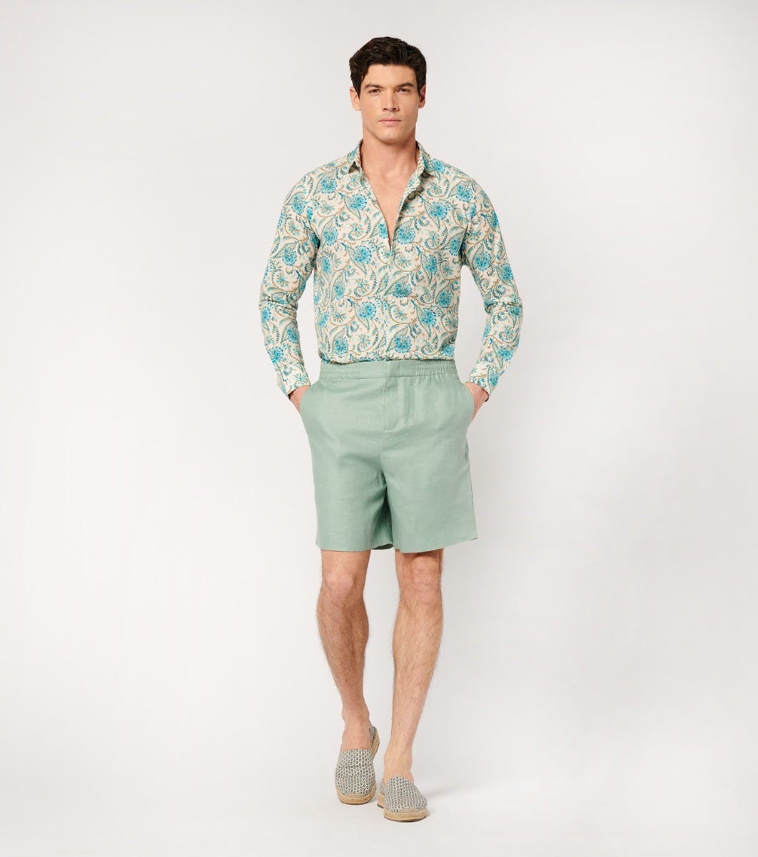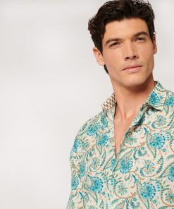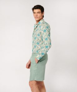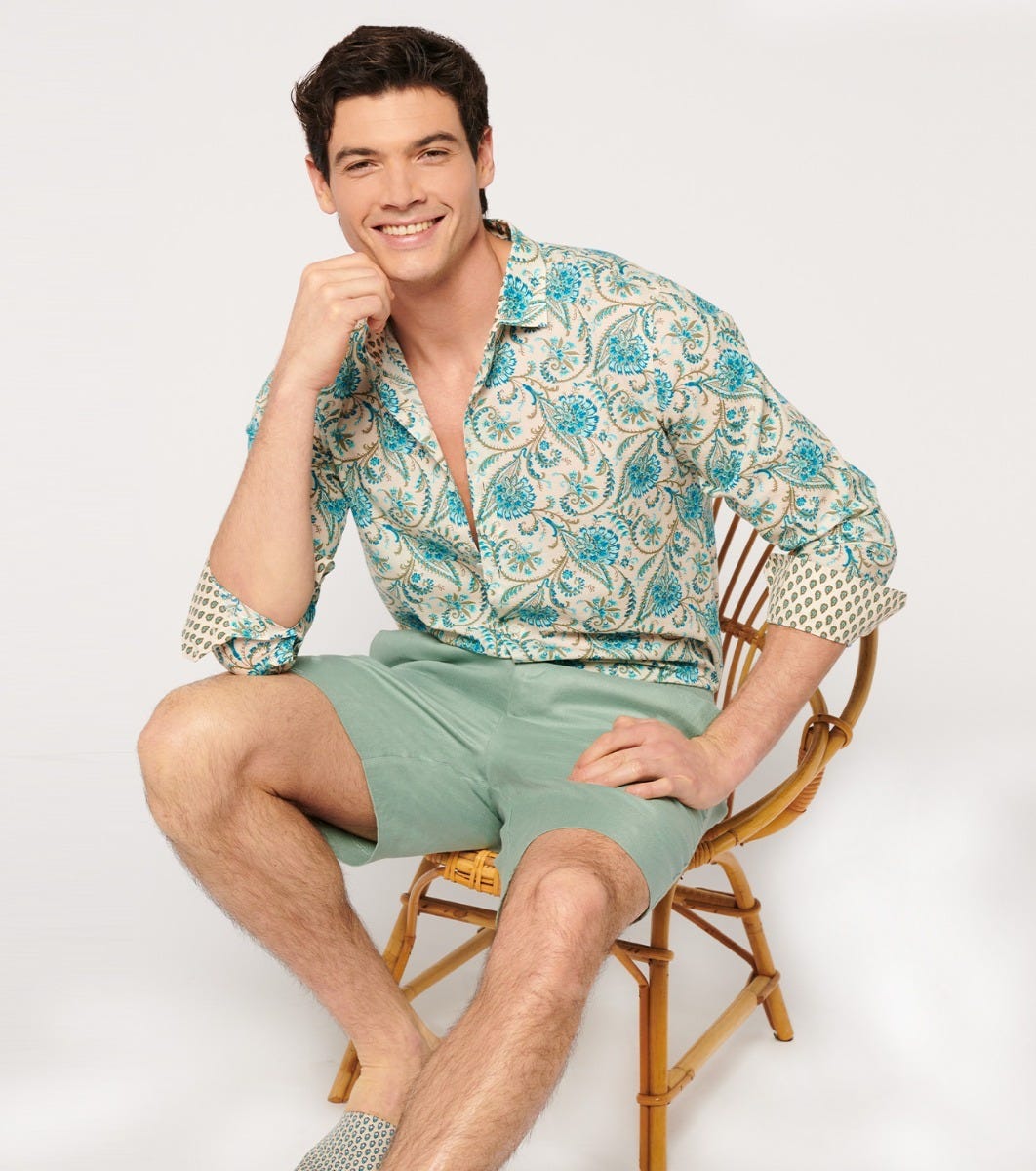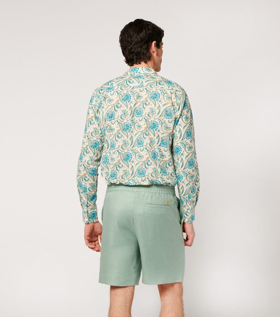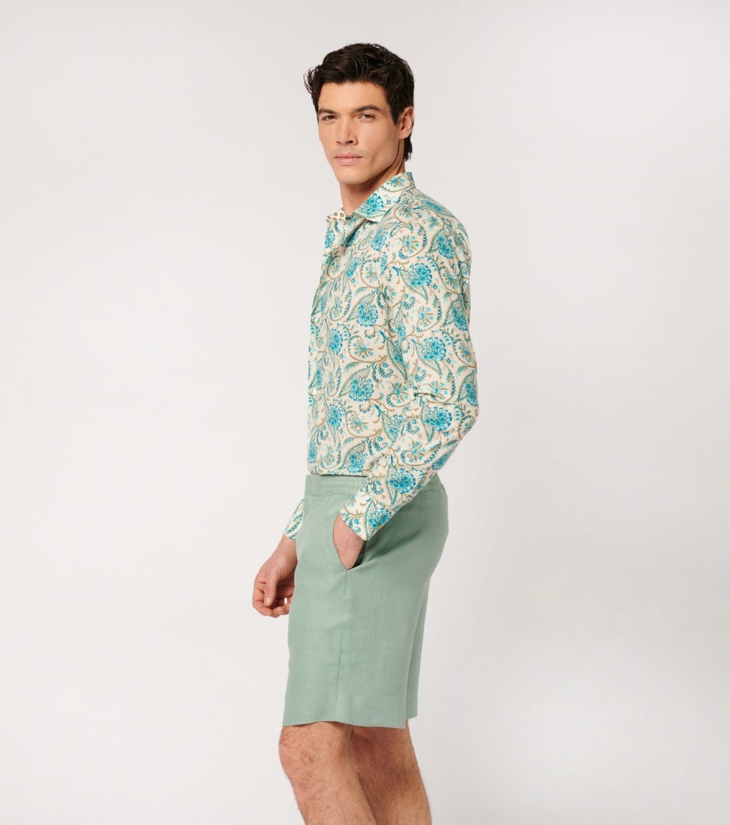 - Détails en opposition intérieure au pied de col et à l’intérieur du poignet avec notre imprimé « Paisely Géo » coloris écru turquoise