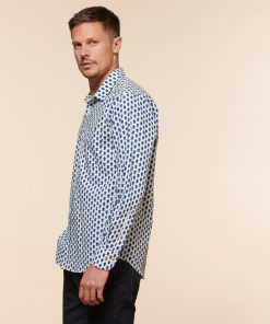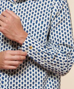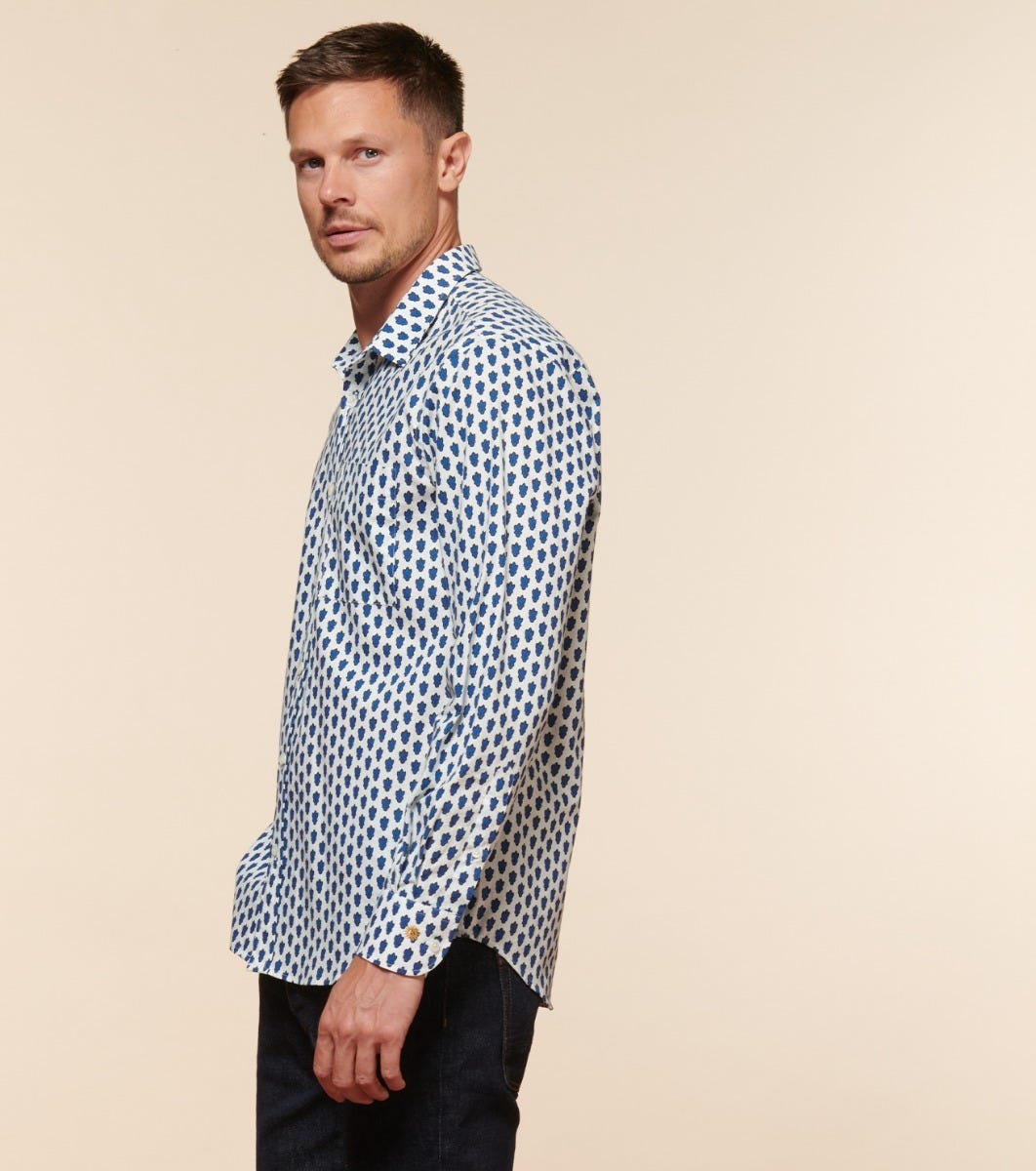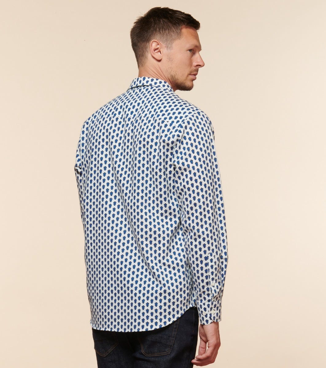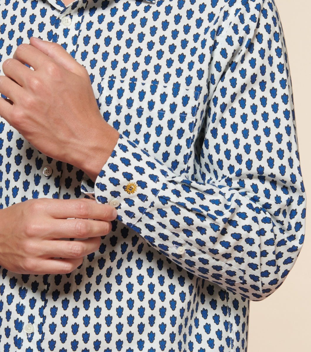 - En batiste de coton, imprimée avec notre motif iconique « La Mouche » coloris blanc bleu