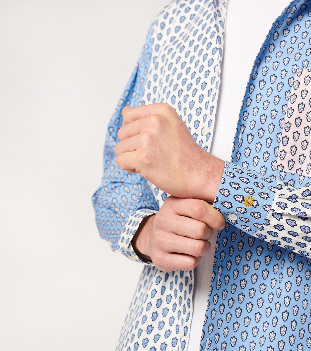 - En popeline 100% coton, jeu de patchwork coloré avec notre motif iconique « La Mouche » coloris ciel, rose et blanc ciel