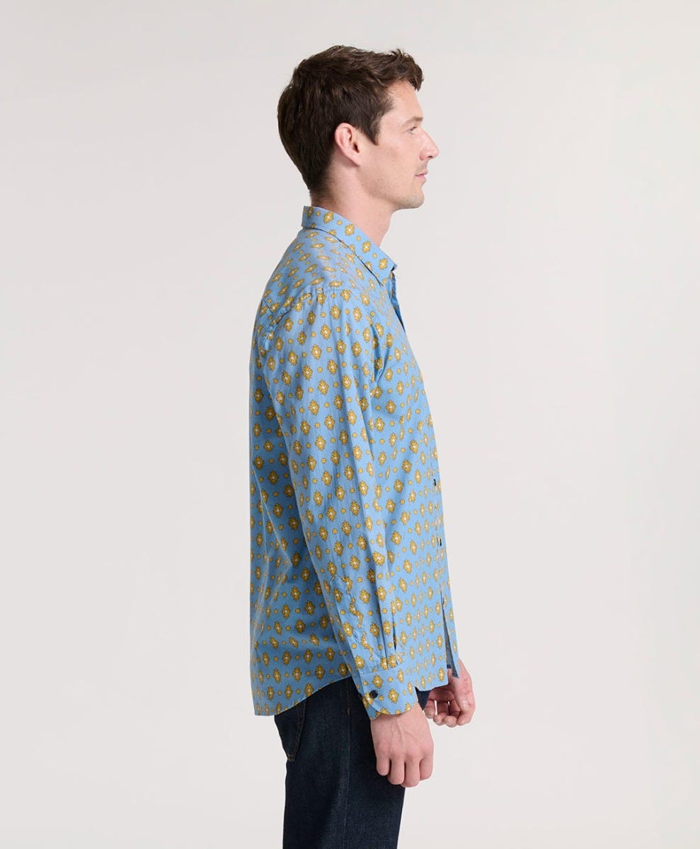 - En batiste de coton, imprimée avec notre motif iconique « La Merveille » coloris bleu jaune