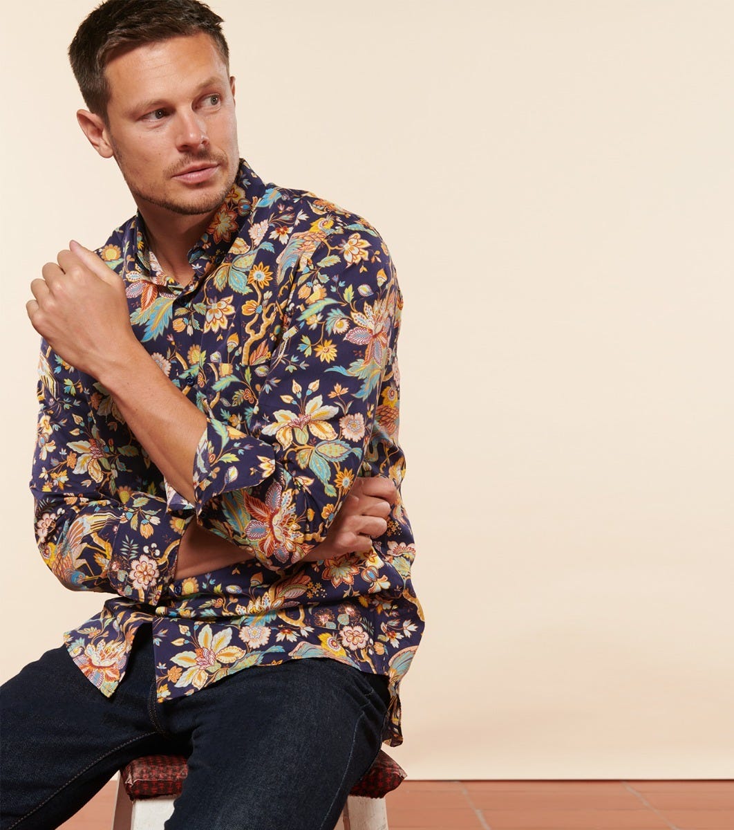 - En popeline 100% coton, imprimée avec notre motif « Héron » coloris nuit ocre